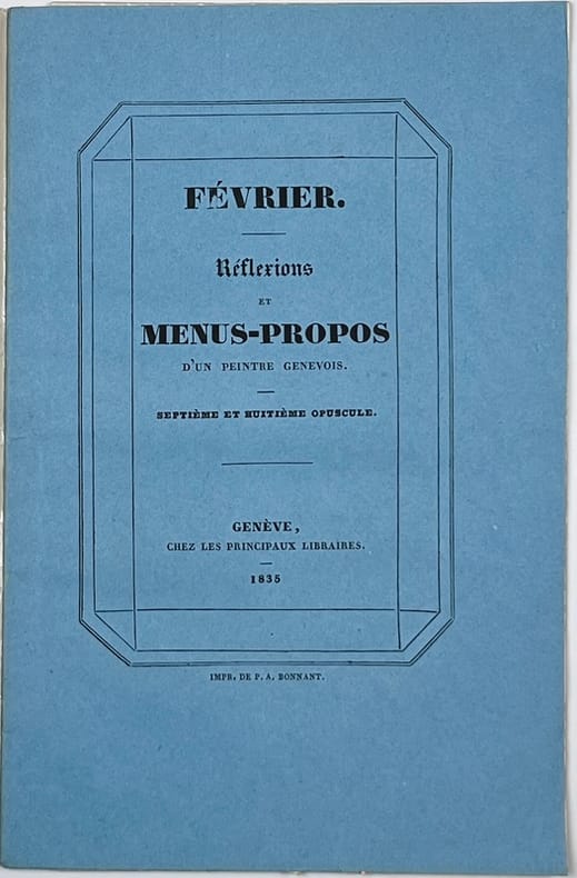 Genève, chez tous les libraires, 1835. Plaquette in-8 brochée de 37-[3] pages, couverture bleue.