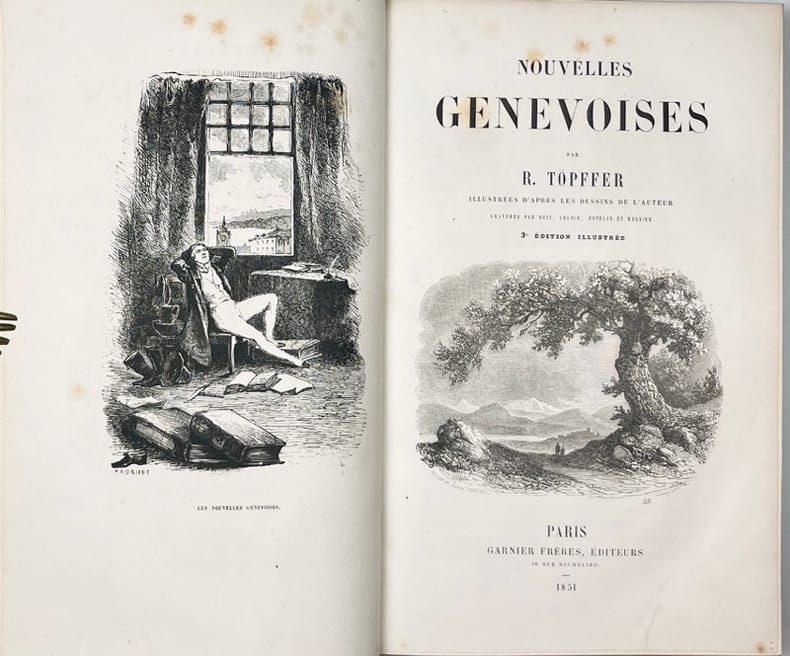 Avec 610 vignettes in-texte et 40 gravures hors-texte gravées, d'après les dessins de l'auteur, par Best, Leloir, Hotelen et Regnier. Paru en 30 livraisons. Contient: La Bibliothèque de mon Oncle; Les deux Scheidegg; L'Héritage; Le Col d'Auterne; Elisa et Widmer; Le Lac de Gers; La Traversée; La Vallée de Trient; Le Grand Saint-Bernard; La Peur. La nouvelle "Les deux Scheidegg" qui 'n'a jamais été publiée à part, ni dans aucune édition muette (sans illustrations) des "Nouvelles genevoises", paraît, dans les édition ill. pour la première fois. Blondel p. 352; Perret 4294.