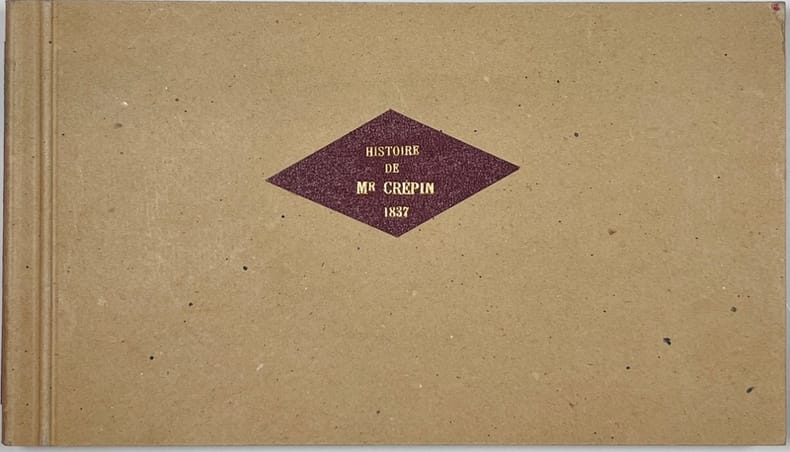 TOPFFER Rodolphe, Histoire de Mr Crépin, à Paris, sans nom d'éditeur, 1922. 75 euros Exemplaire relié à l'italienne (280x180mm), percaline rouge, titre doré au dos, scène de genre imprimée et dorée sur le plat supérieur, tête dorée, 88 feuillets numérotés imprimés au recto. Considéré comme l'un des précurseurs de la bande dessinée, Rodolphe Topffer (1799-1846) est réputé pour ses albums humoristiques. Fondateur d'un pensionnat pour jeunes enfants -à Genève-, Topffer recueille au cours de multiples excursions les éléments pour ses deux premiers albums humoristiques (Voyages en zig-zag, Nouveaux voyages en zig-zag). Volontiers satiriste, l'auteur s'amuse et se joue des méthodes pédagogiques naissantes (la physiognomonie, la craniologie, la phrénologie) par l'entremise des précepteurs Craniose, Bonichon et Fadet. ''Le repas est fort gai, mais ce qui contrarie mr Crépin, c'est que sa femme raffole de la phrénologie, et meurt d'envie d'être tâtée.'' Dos insolé, charnières sensibles, macule blanche sur le plat supérieur.