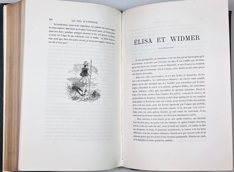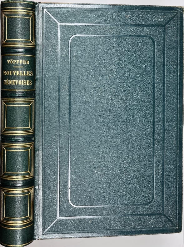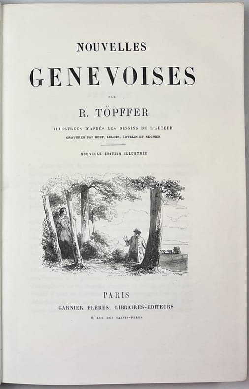 Avec 610 vignettes in-texte et 40 gravures hors-texte gravées, d'après les dessins de l'auteur, par Best, Leloir, Hotelen et Regnier. Paru en 30 livraisons. Contient: La Bibliothèque de mon Oncle; Les deux Scheidegg; L'Héritage; Le Col d'Auterne; Elisa et Widmer; Le Lac de Gers; La Traversée; La Vallée de Trient; Le Grand Saint-Bernard; La Peur. La nouvelle "Les deux Scheidegg" qui 'n'a jamais été publiée à part, ni dans aucune édition muette (sans illustrations) des "Nouvelles genevoises", paraît, dans les édition ill. pour la première fois. Blondel p. 352; Perret 4294.