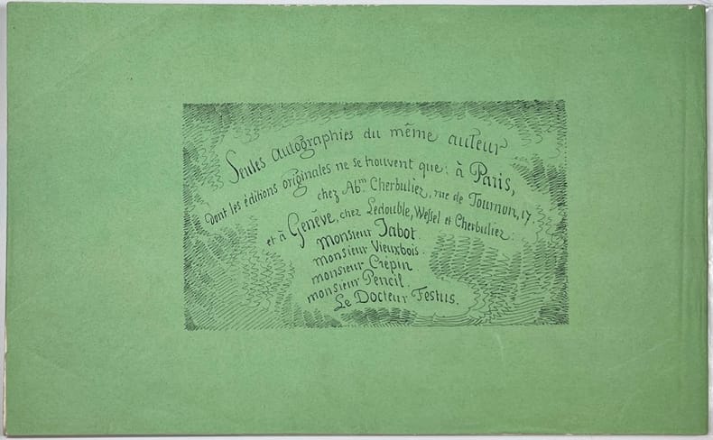 Édition originale. Bel exemplaire tel que paru. La couverture porte au premier plat la mention de l'adresse de la librairie Cherbuliez à Paris, et au second plat figure la liste des albums de Töpffer parus, ainsi que l'adresse genevoise des libraires Ledouble, Wessel et Cherbuliez. Très bel exemplaireMirabaud p. 42; Lonchamp 2967; Suzannet 117 à 117b; Cailllet 29B.