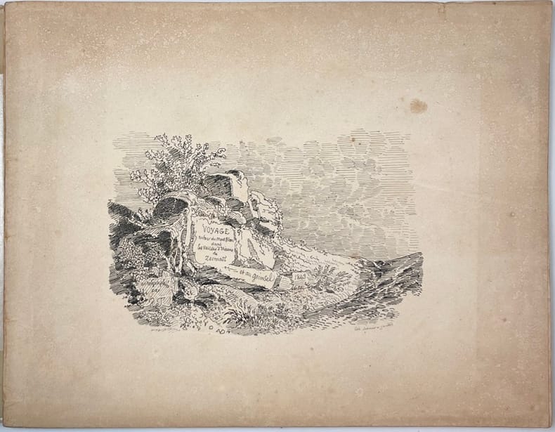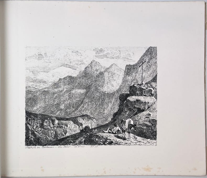 Edition originale de cette suite autographiée, légendairement rare. Les 48 planches de vues et scènes à pleine page représentent l'itinéraire de l'artiste de Genève à Fribourg, en passant par Martigny, le Mont-Blanc (le tour complet), Martigny, Sion, le val d'Hérens, Sierre, Viège, la vallée de Zermatt, Viège, la remontée du cours du Rhône, vallée de Conches, Grimsel, Handeck, Brienz, Fribourg, Genève.L'album comprend au total 51 dessins y compris le dessin sur le titre, celui de la feuille d'introduction, et le dessin sur la page de texte n° 35 bis. Commencé le 20 août 1842, ce voyage de M. et Mme Töpffer, 19 élèves de son pensionnat, et David le domestique, a duré 24 jours. “Le texte de cet ouvrage a été publié pour la première fois (sic! =réimprimé !) dans les «Nouveaux voyages en zigzag»” (Blondel) (1ère éd. des «Nouveaux voyages» 1854. Cf. Lonchamp 2969). Les quatorze voyages autographiés par Töpffer, dont celui-ci est le dernier, ont été tirés à petit nombre, et sont aujourd'hui quasiment introuvables.Original edition of one of the rarest travels accounts around Mont-Blanc by Rodolphe Töpffer. Very fine, clean copy of the original edition signed by Charles Töpffer, son of Rodolphe. Blondel p. 365-366; Perret 4295; Lonchamp 3012; Meckly -; Réan -; cf. Perret - Regards sur les Alpes, page 153. Notice 52 (A). image disp.