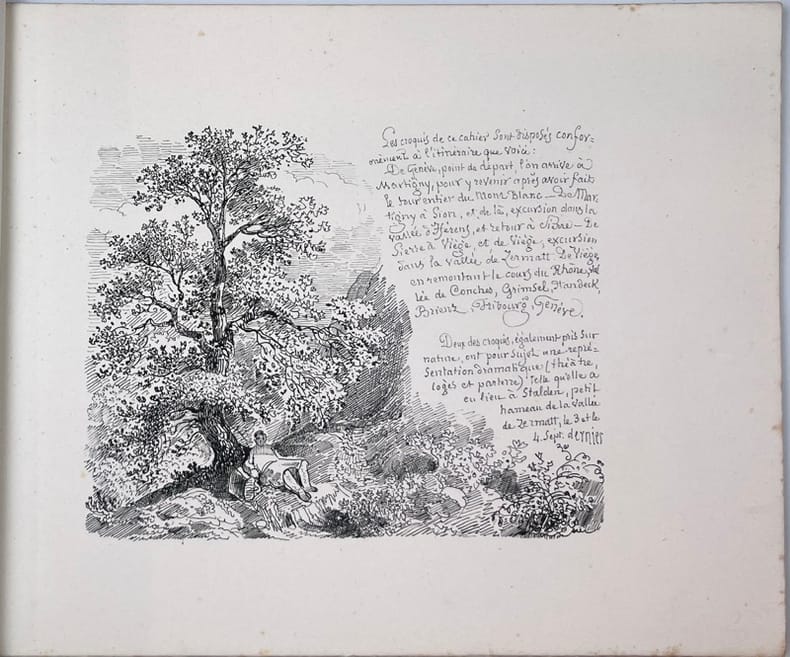 Genève, éd. par l’auteur, (Genève, Lithogr. Schmid), 1843, in-4° oblong, 5 p. illustré d’une vignette de titre, un frontispice + 48 planches de dessins h.-t et d’une vignette dans le texte du voyage, dédicace de Jean-Charles Töpffer, fils de l’auteur „à M. Edmond Laurcau souvenir d’amitié de Ch. Töpffer“ / exlibris Peter E. Obergfell, reliure en d.-cuir, dos orné or, brochure originale illustrée conservée, avec une inscription de Charles Töpffer (fils de l’auteur) sur la couverture, exemplaire d'une remarquable fraicheur.
