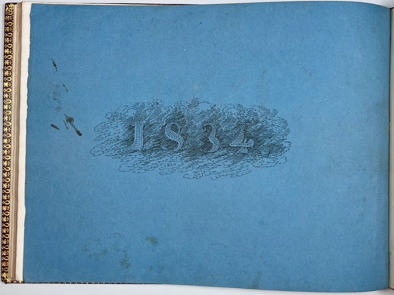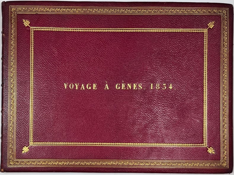 Genève, autographié chez Frutiger, 1835. In-4 oblong, titre-frontispice, une carte et [62] pages, plein maroquin rouge, dos à nerfs orné de filets et fleurons dorés, filets, roulettes et guirlandes dorés encadrant les plats, dentelle intérieure; tranches dorées. Couvertures bleues conservées. Reliure signée Potter & Sons, York.