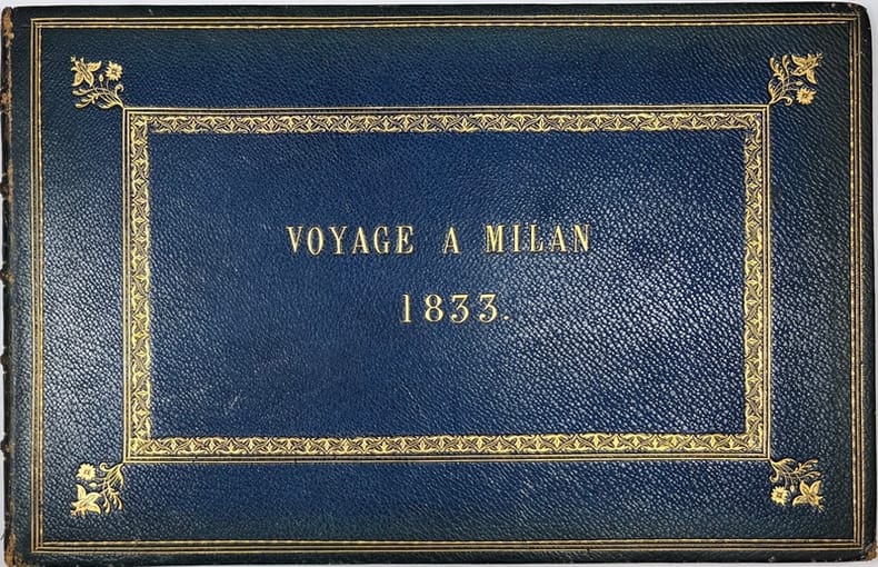 Édition originale. Le Voyage à Milan n'a été compris ni dans les Premiers ni dans les Nouveaux Voyages en zigzag. Cette édition autographiée est donc, comme pour Excursion dans les Alpes, 1832, la seule qui ait existé. Bien que l'on donne cette édition pour avoir été publiée en 1833, elle est parue au début de 1834, comme laisse signifier le dessin in-texte, p. 4, qui est daté de janvier 1834.Le voyage a duré du lundi 16 septembre au vendredi 4 octobre 1833, soit dix-neuf jours. Les élèves étaient au nombre de vingt-trois; M. Töpffer était accompagné de Mme Töpffer et de son ami M. Oscar Galline. Faisaient également partie de la caravane MM. Ritter et Sayous, sous-maîtres, et Marc le domestique. Bel exemplaire très frais. De la bibliothèque Loraine of Kirkharle avec son ex-libris armorié. La reliure n'est pas signée mais nous avons eu un exemplaire de Mr. Jabot absolument identique dont la reliure portait la signature Bagster's binding. Nom gratté sur la couverture.Mirabaud p. 22; Lonchamp 3010; Suzannet 67 et 68; Candaux XV.