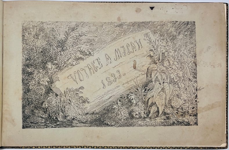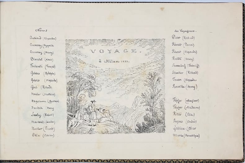 Autographié par J. Freydig, 1833, in-8vo oblong, 1 f. de titre avec une illustration des étudiants au repos, et la liste des élèves sur deux colonnes (à gauche et à droite de l’image) + la carte de l’itinéraire du voyage à Milan (par: Jh. Burdallet del.) + 86 p. chiffrées, avec 5 dessins et 52 vignettes + 1 feuille non chiffrée avec un dessin: un élève en classe... signé ‘1833 R.T. Genève’, (au total il y a 61 dessins à la plume), exlibris Peter E. Obergfell, reliure plein cuir, dos à cinq nerfs, riche encadrement à l’int., couverture de la brochure orig. illustrée brune, avec indication devant sous le titre: autographié par J. Freydig, 2ème couv. avec une vue sur le Lac. Superbe reliure signée Lortic.