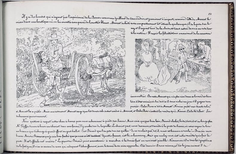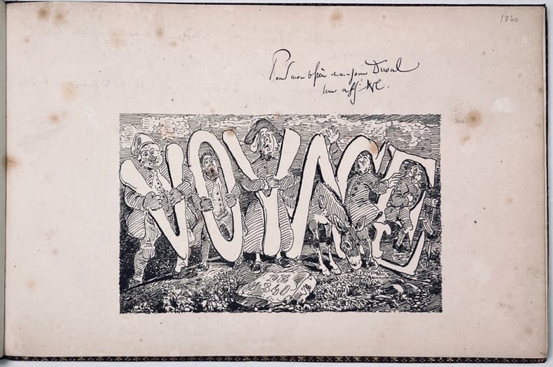 s.l., 1840, in-8vo oblong, 1 plan topographique de la Gemmi + 67 p. chiffrées dont le titre illustré et 69 dessins (incl. page 1: le frontispice: rochers, glaciers, montagnes et sur un rocher l’inscription ‘Voyage de 1840’, exlibris Peter E. Obergfell, brochure originale, couverture vert, le titre autographié en grands caractères, avec des caricatures intercalées entre les lettres, au verso également une caricature. Dos profes. renforcé de papier verte. Bel exemplaire.