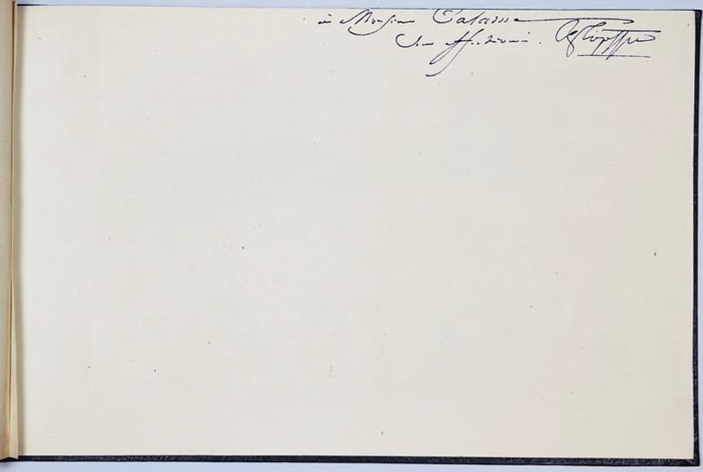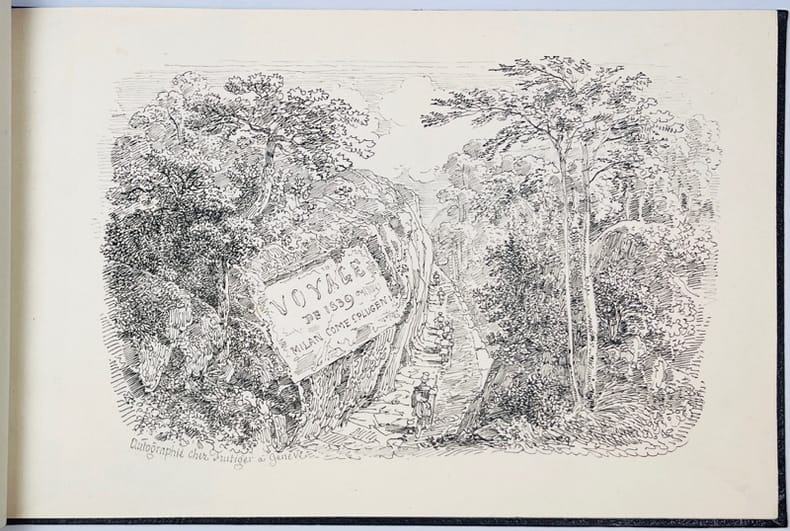 Édition originale enrichie, au premier feuillet blanc, d'une dédicace autographe de l'auteur " à M. Calame son affectionné R.Töpffer." "Commence le 17 août 1839, ce voyage a dure vingt-quatre jours; voyageurs : M. Töpffer, vingt et un élèves, et David le domestique." Mirabaud p. 27; Lonchamp 3015; Suzannet 78b, 79 et 80; Candaux XXII.