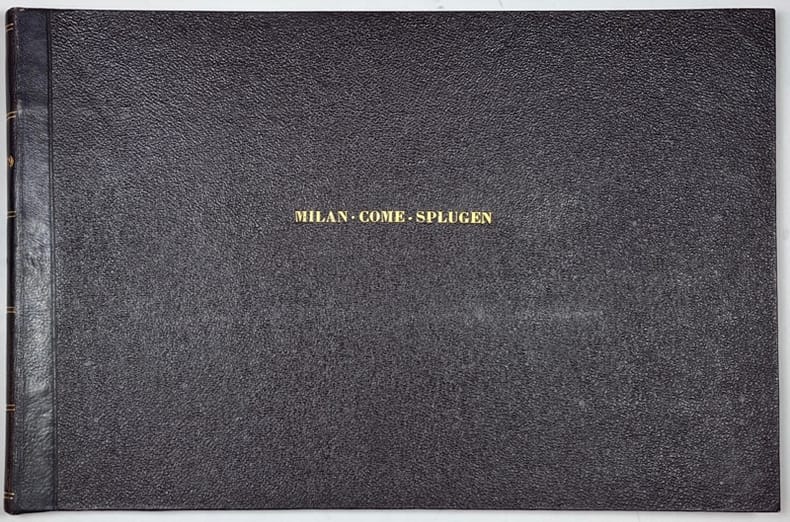Genève, autographié chez Frutiger, [1839]. In-8 oblong, demi-chagrin aubergine, dos lisse orné de filets dorés et de la date, titre partiel au premier plat "MILAN • COME • SPLUGEN". Un feuillet blanc, un feuillet de titre, une carte, 75 pages et un feuillet blanc. Couvertures beiges illustrées conservées.