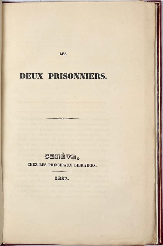 A Genève, chez les principaux libraires; imprimerie de Lador et Ramboz, 1837. In-8 de 80 pages, plein maroquin rouge à grains longs, janséniste, double filet doré sur les coupes et intérieur. Couvertures roses, titre au premier plat, initiales des imprimeurs au second, encadrés d'un décor en noir, dos muet. Non rogné. Reliure signée Hans Asper.