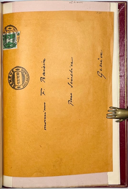 Édition originale. On a relié à la fin une enveloppe adressée à Frédéric Raisin, et un mot du collectionneur C. de Geer : " Permettez-moi de vous offrir cet opuscule et ce dessin original que j'ai trouvé dans ma part de la succession Töpffer. Votre dévoué C. F. de Geer." Hélas, trois fois hélas, le dessin n'est plus là...Mirabaud p. 9; Lonchamp 2928; Suzannet 27 à 31.