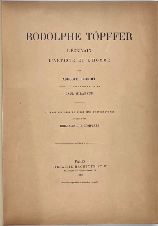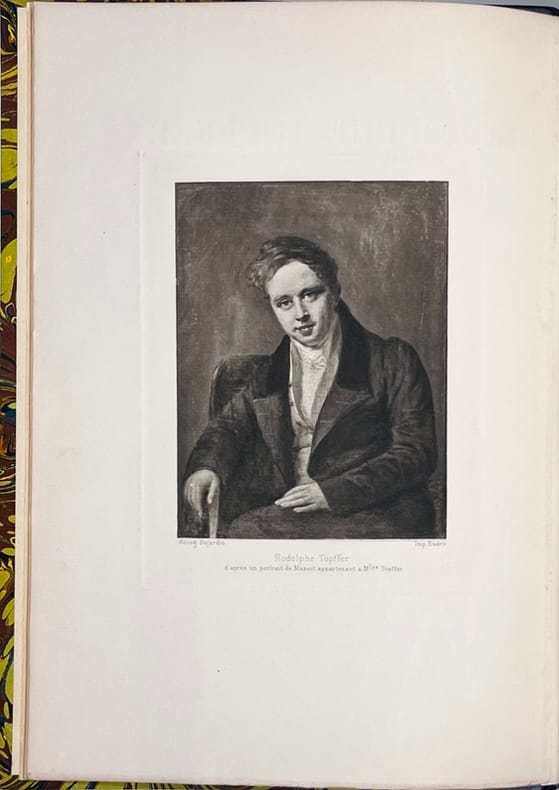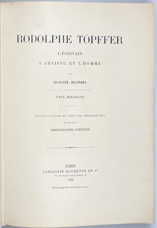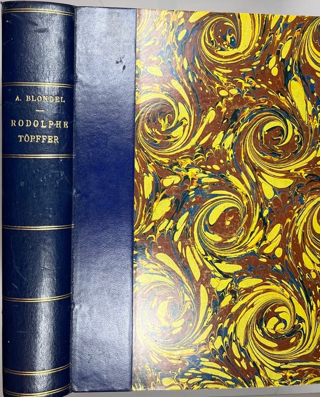 First Edition. Beautiful copy of this illustrated life of Töpffer, with a complete bibliography. Half tan leather binding, with marbled boards and gilt titles to the spine. Good, clean, solid condition, with a touch of rubbing only Top edge gilt. Internally in good, clean condition. Pages are fractionally darkened. Illustrations are nicely printed to art paper with tissue guards. Original covers are bound in, and clean, if a little darkened. 416 pages. 290 by 210mm (11œ by 8Œ inches). Rodolphe Töpffer (17991846) was a Swiss teacher, author, painter, cartoonist, and caricaturist. Considered by many to have produced the first comic books in history.