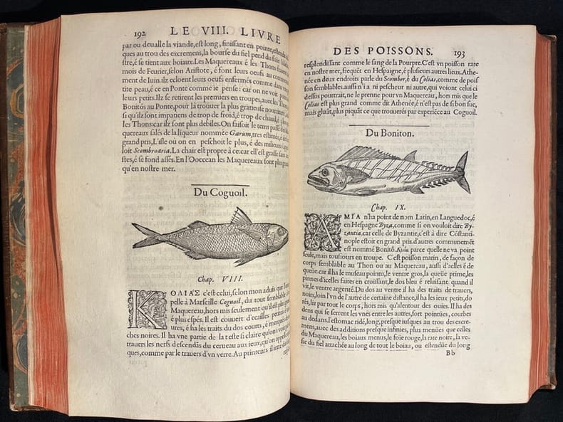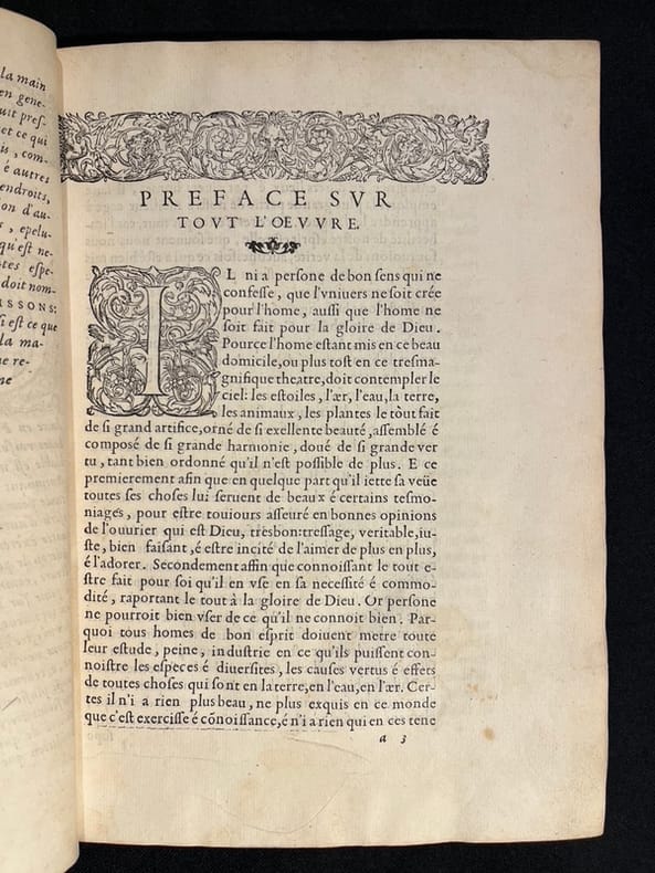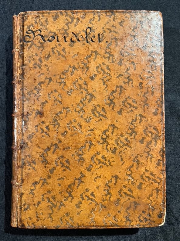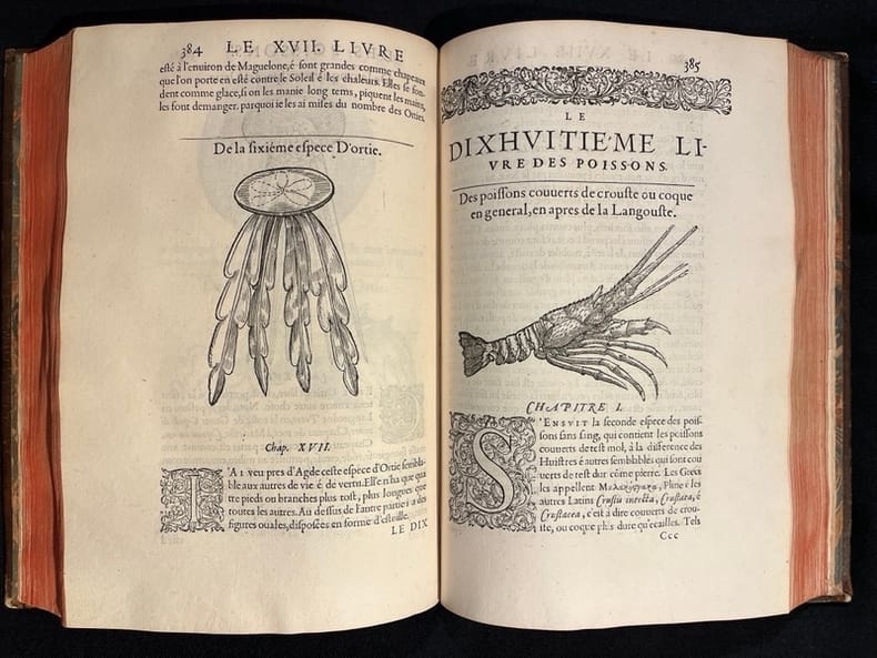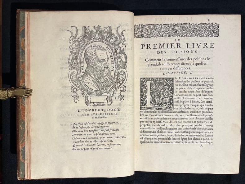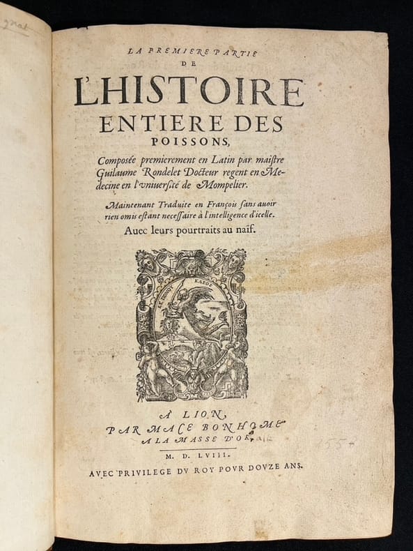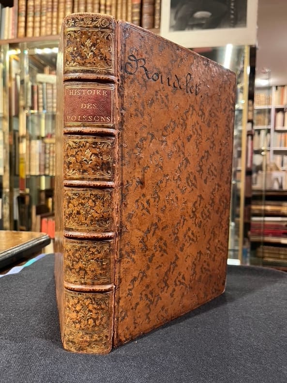 Superbe illustration gravée sur bois, comprenant plus de 420 figures d'animaux aquatiques, poissons de mer et d'eau douce, crustacés, mollusques, insectes, batraciens et zoophytes, dont Baudrier attribue la composition, très fine, à l'artiste lyonnais Georges Reverdy. Un beau portrait de l'auteur placé dans un cadre à enroulements est imprimé dans les feuillets liminaires et répété dans la seconde partie ; il est attribué au célèbre Pierre Eskrich, dit Pierre Vase. Édition originale de la seule traduction française, faite par Laurent Joubert, du plus important traité d'ichtyologie publié jusqu'alors. Cette édition française est bien plus prisée que l’originale latine, sortie des presses du même imprimeur lyonnais en 1554-1555, les deux éditions étant d'ailleurs «également remarquables par la belle exécution des gravures sur bois» selon Brunet. On a inscrit proprement à la plume le nom de l'auteur sur le premier plat.Mouillures aux derniers feuillets. Mors partiellement fendus, coins frottés.