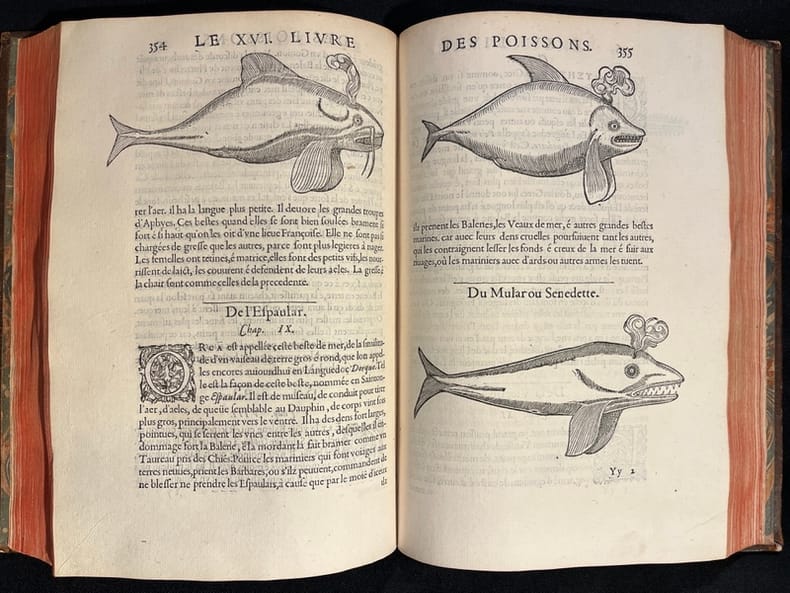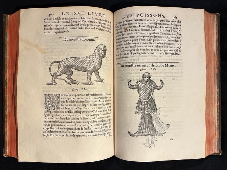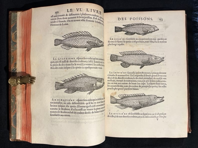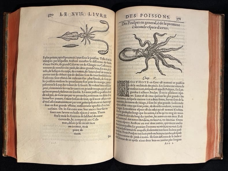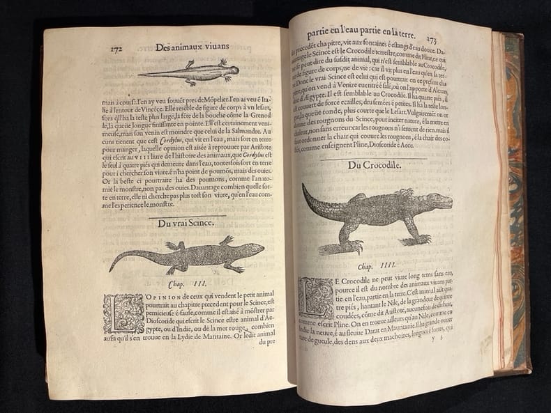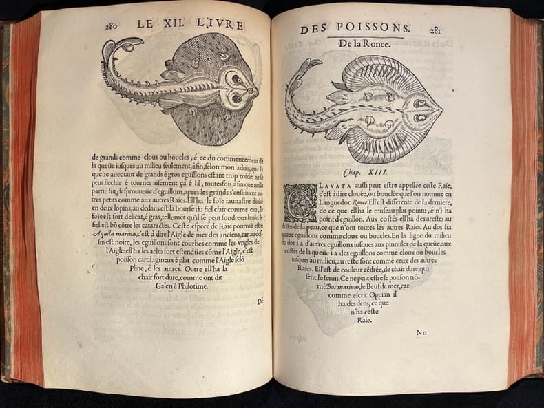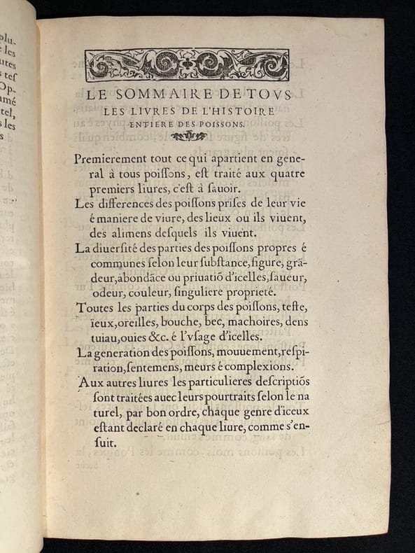 Superbe illustration gravée sur bois, comprenant plus de 420 figures d'animaux aquatiques, poissons de mer et d'eau douce, crustacés, mollusques, insectes, batraciens et zoophytes, dont Baudrier attribue la composition, très fine, à l'artiste lyonnais Georges Reverdy. Un beau portrait de l'auteur placé dans un cadre à enroulements est imprimé dans les feuillets liminaires et répété dans la seconde partie ; il est attribué au célèbre Pierre Eskrich, dit Pierre Vase. Édition originale de la seule traduction française, faite par Laurent Joubert, du plus important traité d'ichtyologie publié jusqu'alors. Cette édition française est bien plus prisée que l’originale latine, sortie des presses du même imprimeur lyonnais en 1554-1555, les deux éditions étant d'ailleurs «également remarquables par la belle exécution des gravures sur bois» selon Brunet. On a inscrit proprement à la plume le nom de l'auteur sur le premier plat.Mouillures aux derniers feuillets. Mors partiellement fendus, coins frottés.