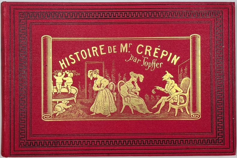 TOPFFER Rodolphe, Histoire de Mr Crépin, à Paris, sans nom d'éditeur, 1922. 75 euros Exemplaire relié à l'italienne (280x180mm), percaline rouge, titre doré au dos, scène de genre imprimée et dorée sur le plat supérieur, tête dorée, 88 feuillets numérotés imprimés au recto. Considéré comme l'un des précurseurs de la bande dessinée, Rodolphe Topffer (1799-1846) est réputé pour ses albums humoristiques. Fondateur d'un pensionnat pour jeunes enfants -à Genève-, Topffer recueille au cours de multiples excursions les éléments pour ses deux premiers albums humoristiques (Voyages en zig-zag, Nouveaux voyages en zig-zag). Volontiers satiriste, l'auteur s'amuse et se joue des méthodes pédagogiques naissantes (la physiognomonie, la craniologie, la phrénologie) par l'entremise des précepteurs Craniose, Bonichon et Fadet. ''Le repas est fort gai, mais ce qui contrarie mr Crépin, c'est que sa femme raffole de la phrénologie, et meurt d'envie d'être tâtée.'' Dos insolé, charnières sensibles, macule blanche sur le plat supérieur.