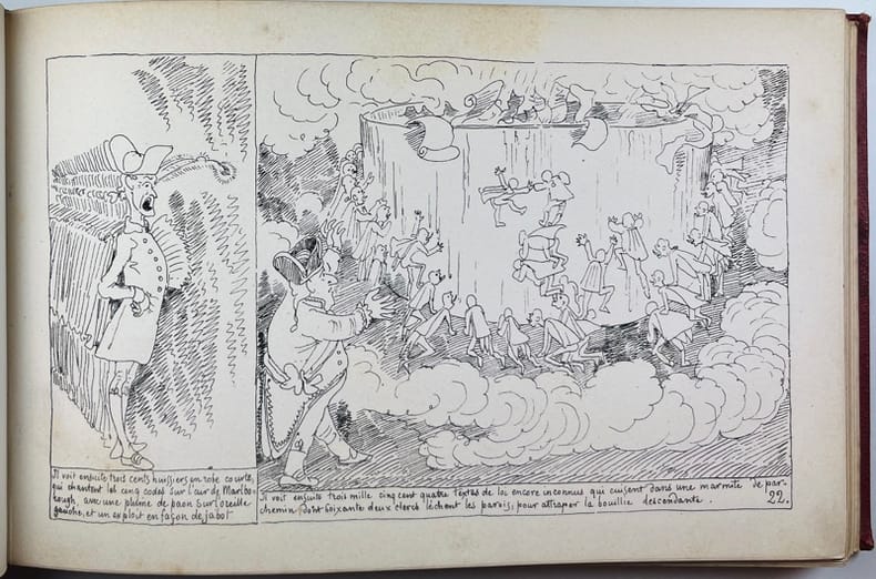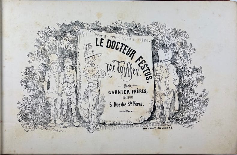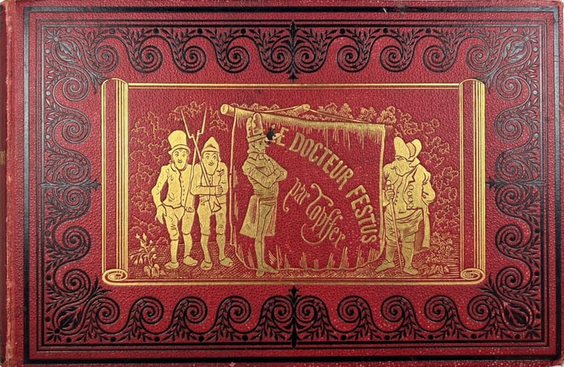 88 pages illustrées par TOPFFER, à la mode d'une bande dessinée ancienne, narrant les périgrinations et autres aventures du Docteur Festus, au XVIIIe siècle. Une histoire badine illustrée de dessins expressifs. Us. mors., accrocs au dos près des tranchefiles inférieur et supérieur.