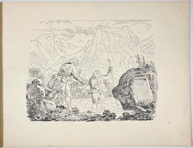 Illustré de 7 compositions de Rodolphe Töpffer autographiées à pleine page, 2 pour les couvertures et 5 dans l'ouvrage. Édition originale très rare. « A cette occasion, Töpffer renonce à l'illustration d'un voyage complet pour des raisons de santé (sa vue est de plus en plus brouillée)... Dans une certaine mesure, cette ultime relation touristique boucle un parcours iconographique, puisque Töpffer revient au principe des planches isolées qui ornaient le recto de ses premiers albums» (Kaenel p. 215). Deux petites mouillures dans la marge supérieure, néanmoins bel exemplaire de cette rare et fragile publication. Mirabaud p. 62; Lonchamp 3000; Suzannet, 93 et 94; Philippe Kaenel, Les Voyages illustrées, dans "Töpffer", éd. Skira, 1996.