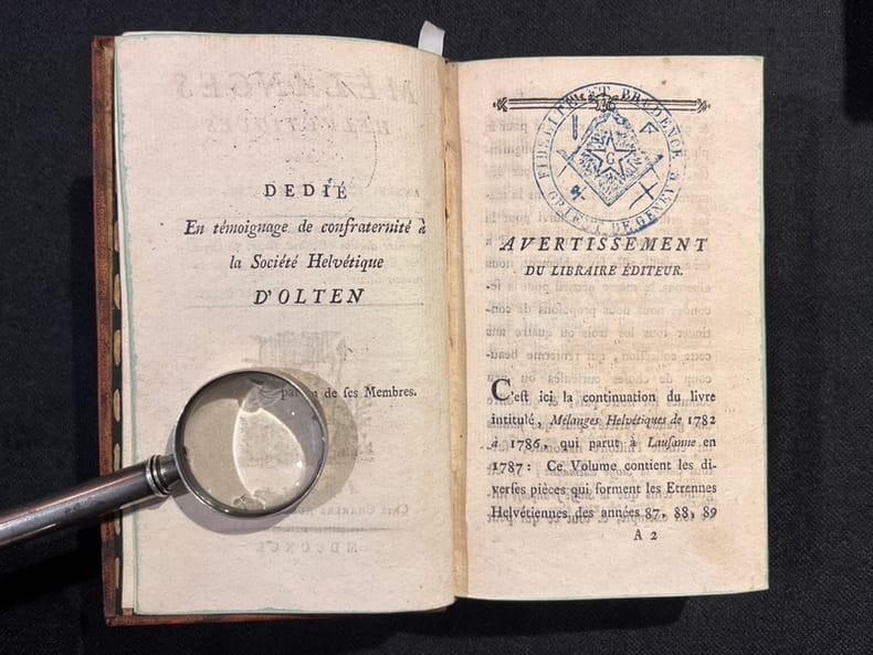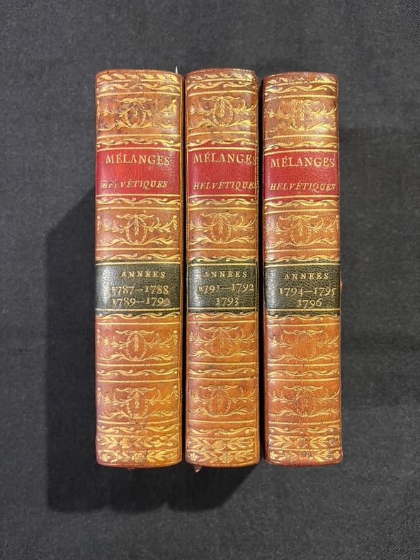 Jolie série dont chacun des volumes se divise en partie historique, partie descriptive et partie littéraire. A la fin du troisième volume, longue note manuscrite sur deux pages relatives à la charte de la fondation de l'abbaye de Payerne. Les trois volumes sont frappés du tampon (au début et à la fin) de la loge maçonnique Loge Fidélité et Prudence de Genève. Minime manque de peau à trois plats, ce sont néanmoins de bons exemplaires. !!! !!! Du 3 octobre au 24 octobre il n'y aura pas d'expédition de colis: le libraire est en voyage. La librairie reste ouverte et nous répondrons sporadiquement aux emails. Merci pour votre compréhension. ––> From 3 October to 24 October, there will be no parcel deliveries as the bookseller will be travelling. The bookshop will remain open and we will respond to emails sporadically. Thank you for your understanding.