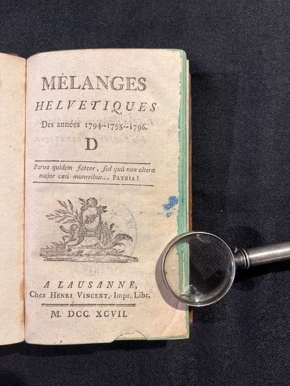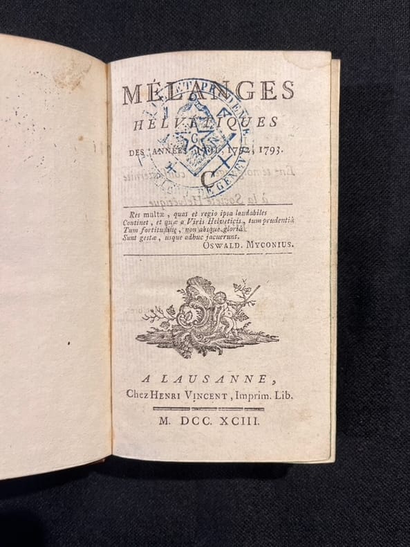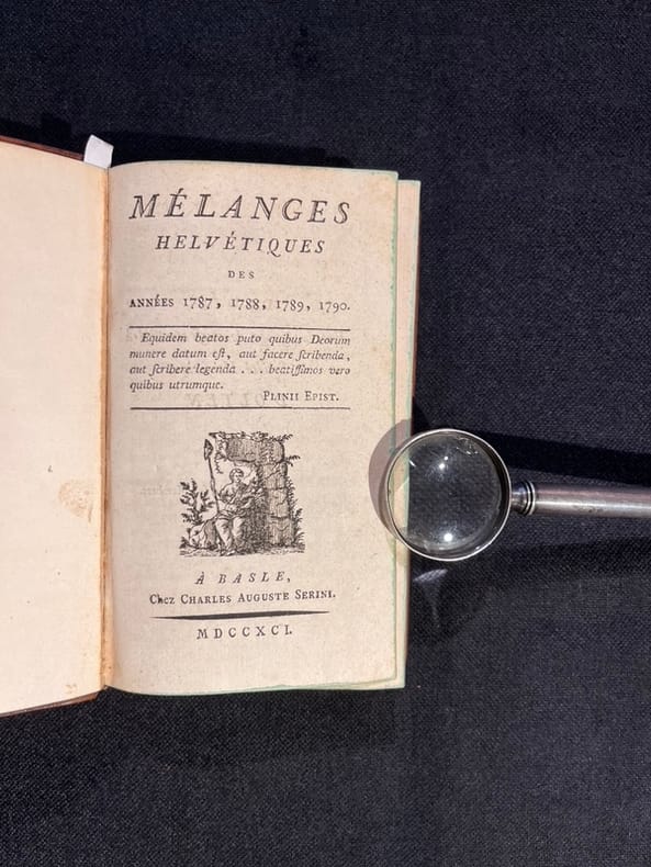 A Basle, chez Charles Auguste Serini, A Lausanne, chez Henri Vincent, 1787 -1791-1793-1797. 4 volumes in-12 de 370; 637; 540 et 535 (chiffrée par erreur 525) pages, cartonnage de papier vert caca d'oie, dos lisses ornés de filets dorés, pièces de titre rouge cerise, tranches rouges.