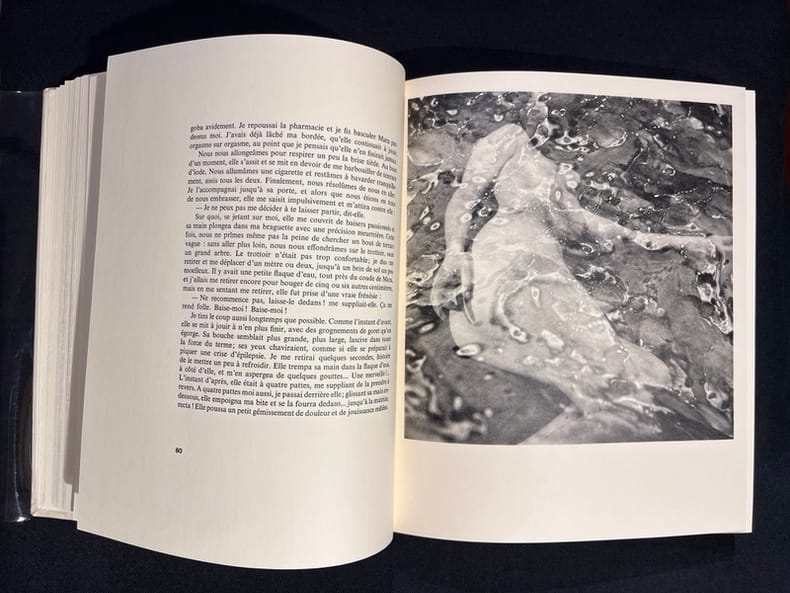 Illustré par Emil Cadoo de 48 photos de corps entrelacés (inspiration Lucien Clergue mâtinée Man Ray...). Très belle édition, un des 600 exemplaires numérotés (279) sur beau papier vergé gothique teinté contenant 48 planches, le reste du tirage - à 1000 - n'en contenant que 18. La maquette est de Serge Kristy. Postface de Maurice Nadeau.