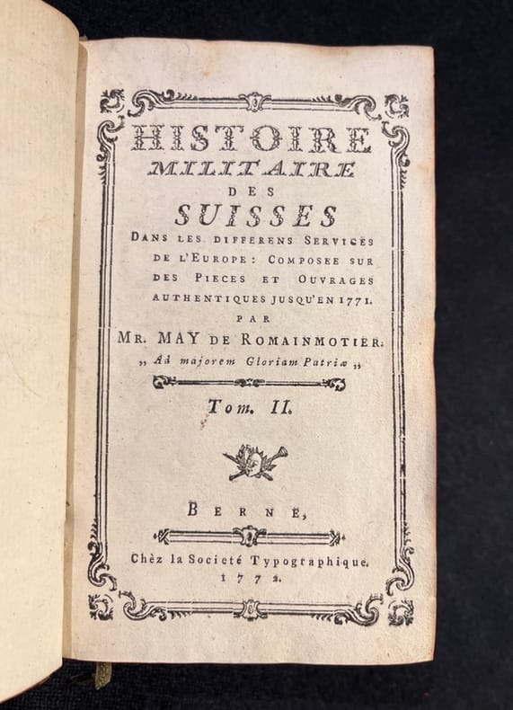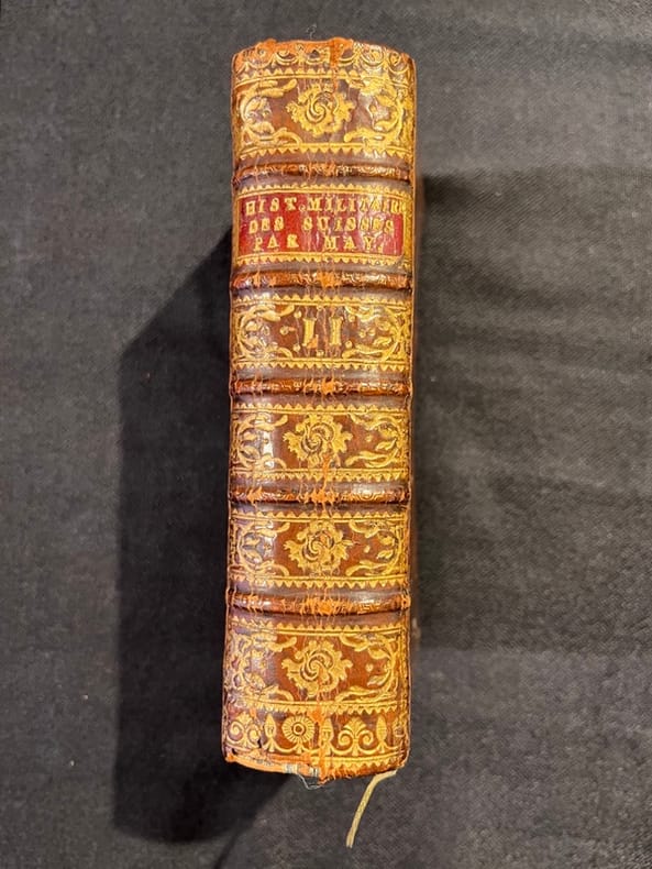 Tome II seul qui continent l'histoire militaire des suisses au service d'Espagne; de la maison de Savoie; des Papes; de la République de Venise; de L. H. Puissances; dans les services non avoués, par les membres du corps helvétique (Suède, Danemark, Russie, maison de Brandebourg, Saxe, Cologne, Bavière, Cercle de Souabe); au service de sa Majesté le Roi des Deux Siciles; de l'Ordre de Malte. Deux coins frappés, petits manques aux coiffes, sinon bon exemplaire. !!! !!! Du 3 octobre au 24 octobre il n'y aura pas d'expédition de colis: le libraire est en voyage. La librairie reste ouverte et nous répondrons sporadiquement aux emails. Merci pour votre compréhension. ––> From 3 October to 24 October, there will be no parcel deliveries as the bookseller will be travelling. The bookshop will remain open and we will respond to emails sporadically. Thank you for your understanding.