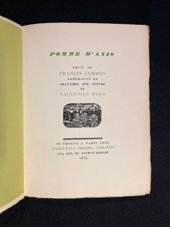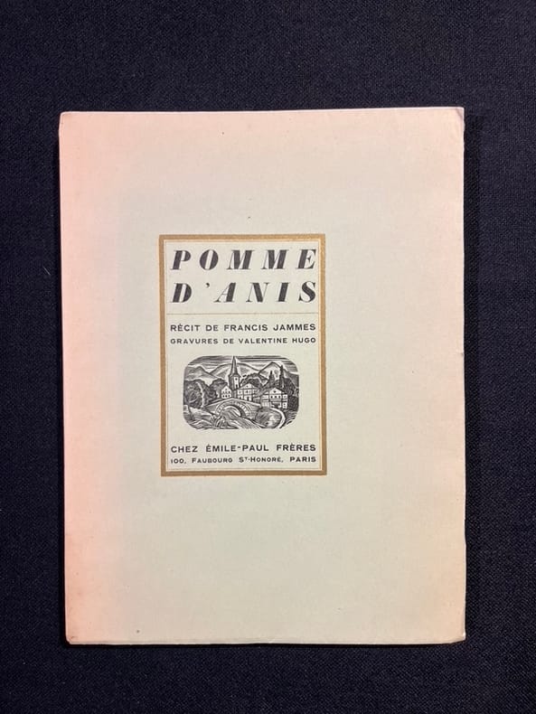Pomme d'Anis est né d'une rencontre faite à la gare de Mont-de-Marsan, en 1904, lorsque Jammes observe dans son wagon avec une jeune fille légèrement infirme - elle boitait - qui, se penchant à la fenêtre, voit arriver un jeune homme atteint de la même infirmité. «Pauvre garçon, aussi malheureux que moi», entend-il de la bouche de la jeune fille. Jammes s'empare alors de cette scène pour cette nouvelle dont il envoya les épreuves à Colette, avec qui une amitié solide s'était nouée depuis l'année précédente : " sa compréhension profonde de la campagne et de tous ceux qui la peuplent - hommes, bêtes et plantes -, sa pitié pour les humbles, son goût des vieilles demeures, des jardins parfumés (...) rien de Francis Jammes qui n'éveillât en Colette une ardente résonance " (in Colette & Francis Jammes, une amitiés inattendue). Cette dernière lui envoyant, pour qu'il les jugeât, ses premiers Dialogues de bêtes dont Jammes, in fine, donnera la préface. Les gravures sont de Jean Hugo : celles faites par Valentine, son épouse, furent perdues chez l'éditeur au moment du tirage et c'est alors son mari, l'arrière petit-fils de Victor Hugo, épousé en 1919, qui en composa 8 nouvelles afin de les remplacer. En dehors des lettres expliquant l’affaire, on connaît un exemplaire avec cette dédicace à quatre mains : « Avec ma fidèle amitié, cette imposture, Valentine Hugo, Jean Hugo ». Monod, I , 6353 ; Talvart, X, 70 ; Carteret, V, 111 : Anne de Margerie, Valentine Hugo.