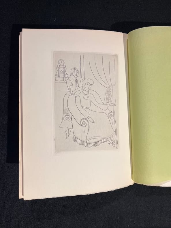 Paris, Émile-Paul frères, 1923 1 vol. (165 x 220 mm) de 85 pp., [3] et 1 ff. +7 planches, broché sous couverture verte rempliée. Édition originale, illustrée de 8 gravures de Valentine Hugo [Jean Hugo]. Un des 15 premiers exemplaires sur vieux japon (n° 3), avec une suite des illustrations tirées sur vergé.