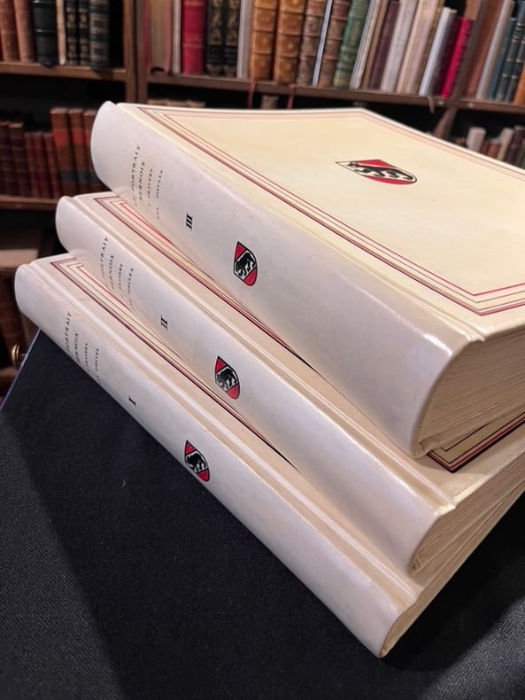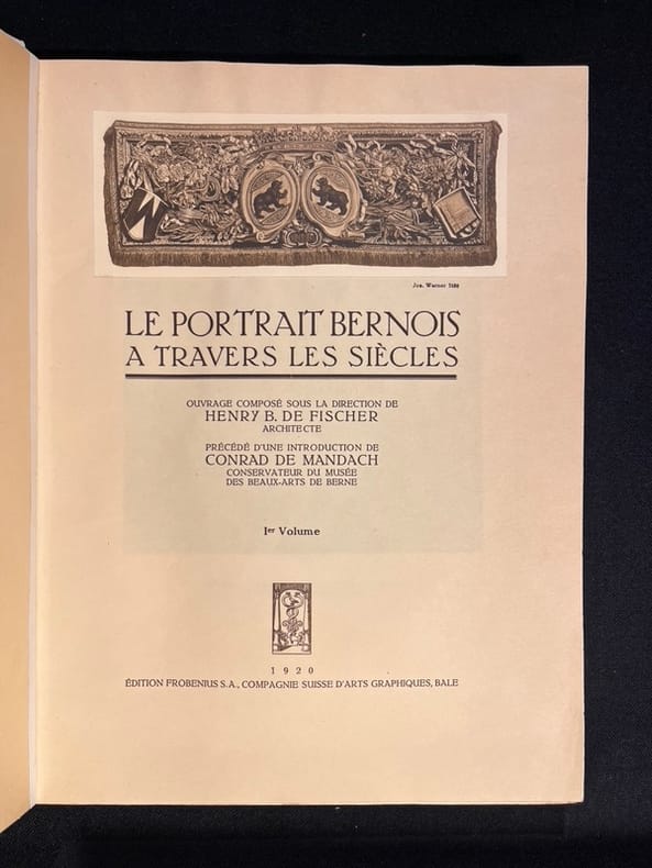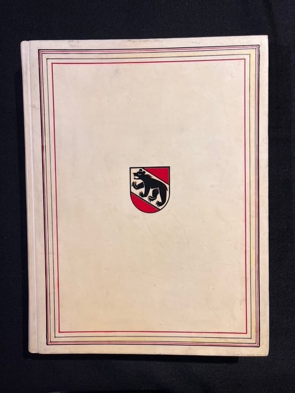 Bâle, Frobenius, Compagnie suisse d'arts graphiques, 1920 - 1932. 3 volumes grand in-4, relié en plein vélin blanc, dos lisses ornés des armes de Berne peintes en rouge et noir, titre caligraphié, plats encadré de triplet filet noir et double rouge, armes de Berne peintes au centre. Couvertures conservées.