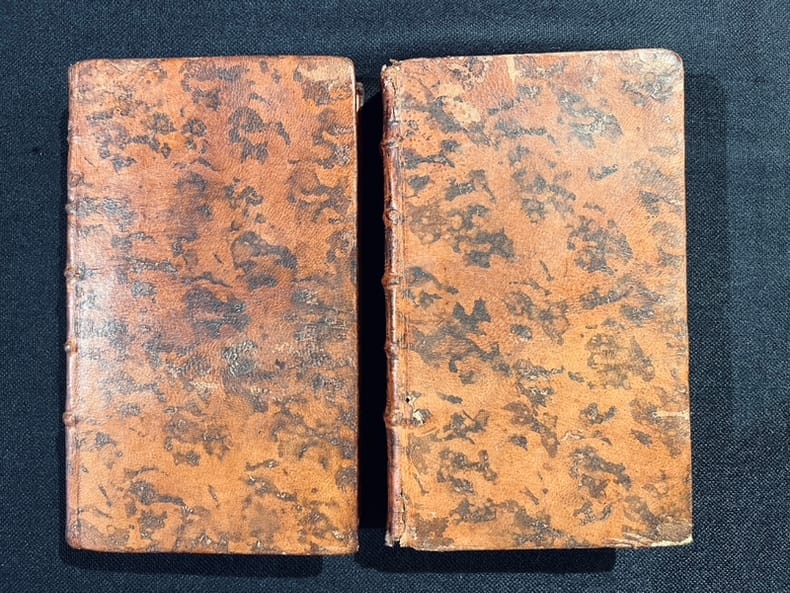 Au tome premier, p. 24 on trouve un petit tampon "Lyon 1777" et une signature: Clavel. Petits manques aux coiffes, reliure épidermée.