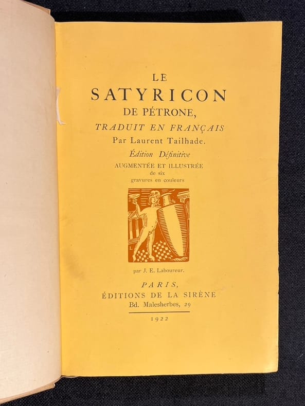 Le Satyricon de Pétrone, traduit par Laurent Tailhade. Nouvelle édition revue, corrigée, augmentée et illustrée de six gravures en couleurs par J. E.Laboureur. (Paris: Edition de la Sirène, 1922). [M.C.: Littérature latine, livre illustré moderne]