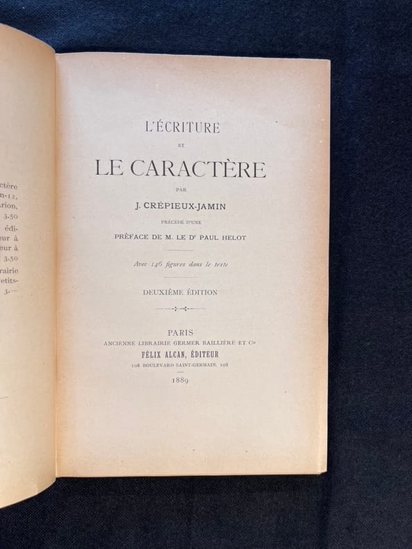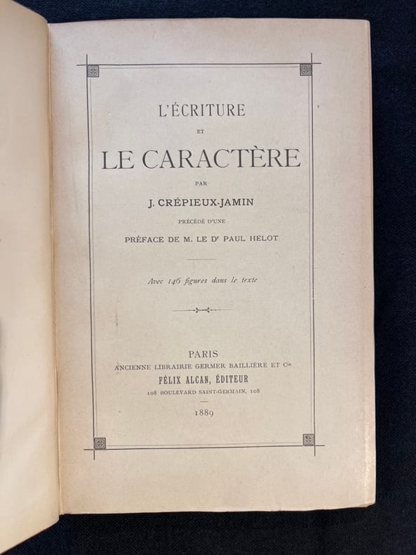 Avec 146 figures dans le texte. Bel exemplaire très bien établi par un maître relieur. Envoi autographe de l'auteur : "A mon ami Bovet, hommage du coeur! Crépieux-Jamin". Alfred Bovet, neuchâtelois fut le plus grand collectionneur d'autographes de son temps. Petite curiosité, l'ouvrage a été imprimé à Genève, à l'Imprimerie Suisse.