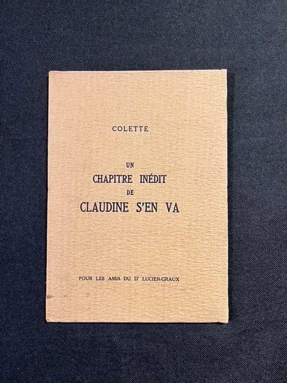Paris Pour les Amis du Dr Lucien-Graux 1937 1 vol. Broché plaquette in-8, brochée, couverture rempliée, non rogné, 26 pp. Edition originale. Tirage limité à 60 exemplaires, celui-ci un des 10 numérotés sur bibliophile crème, signé par Colette.Cédant aux sollicitations des bibliophiles et à la nécessité d’assurer son indépendance financière, Colette accepta à deux reprises de publier à tirage limité des «chapitres inédits» de ses œuvres les plus célèbres: Un chapitre inédit de Claudine s’en va, en 1937, à la demande du célèbre collectionneur le Dr Lucien-Graux, et Avril. Un chapitre anticipé du «Blé en herbe», en 1949, à la demande de l’imprimeur-graveur Jean-Gabriel Daragnès. Riche fabricant de produits pharmaceutiques, le Dr Lucien-Graux fit fortune grâce à un médicament luttant contre l’acide urique mais aussi grâce à la création d’une maison de parfum qui connut un succès international: Arys. Il réunit pendant l’entre-deux-guerres une des plus importantes collections de livres et de manuscrits de son temps qui lui valut le surnom de «prince des bibliophiles». Fin lettré, il créa une petite maison d’édition «Les Amis du Dr Lucien-Graux» où il publia à petit nombre des textes inédits. Résistant, il fut arrête et déporté et mourut à Dachau en 1944. Sa collection de livres et de manuscrits fut dispersée dans les années 50 en neuf ventes historiques sous le marteau de Maurice Rheims. Parmi les lots se trouvaient un très rare ensemble des quatre volumes des Claudine sur hollande avec cette dédicace: «À mon confrère le Docteur Lucien Graux qui sait garder tout frais ce vieux péché de ma jeunesse,Colette». (Notice de Frédéric Maget pour le catalogue de la collection Colette des Clarac)
