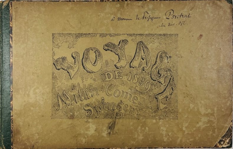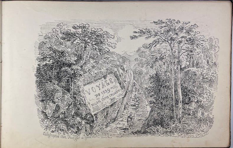 Genève, autographié chez Frutiger, [1839]. In-8 oblong, demi-chagrin aubergine, dos lisse orné de filets dorés et de la date, titre partiel au premier plat "MILAN • COME • SPLUGEN". Un feuillet blanc, un feuillet de titre, une carte, 75 pages et un feuillet blanc. Couvertures beiges illustrées conservées.