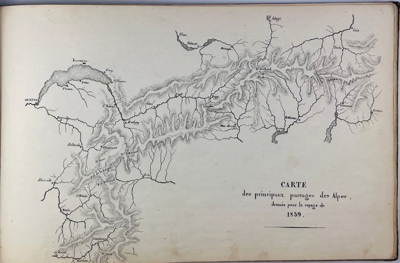 Édition originale enrichie d'un envoi autographe de Töpffer sur la couverture "à madame Prévost Marcet de la part de son dévoué RT." Noms de propriétaires l'un au crayon : J. L. Prevost, le second, à la plume: Suzanne Pictet, 1862. "Commencé le 17 août 1839, ce voyage a duré vingt-quatre jours; voyageurs: M. Töpffer, vingt et un élèves, et David le domestique." Mirabaud p. 27; Lonchamp 3015; Suzannet, 78b, 79 et 80; Candaux, XXII.