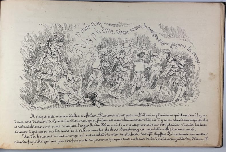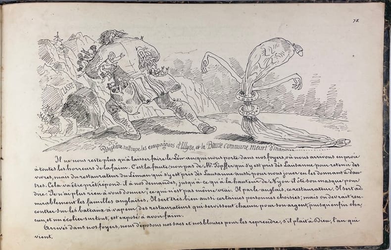 Édition originale enrichie, au premier feuillet blanc, d'une dédicace autographe de l'auteur " à M. Calame son affectionné R.Töpffer." "Commence le 17 août 1839, ce voyage a dure vingt-quatre jours; voyageurs : M. Töpffer, vingt et un élèves, et David le domestique." Mirabaud p. 27; Lonchamp 3015; Suzannet 78b, 79 et 80; Candaux XXII.