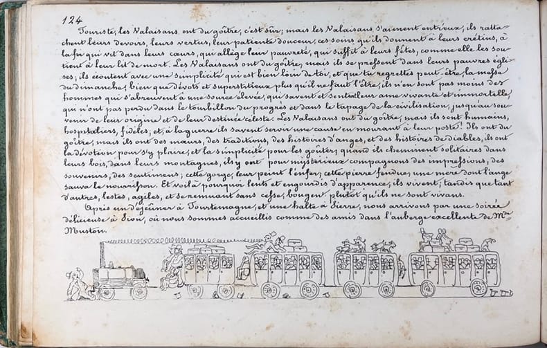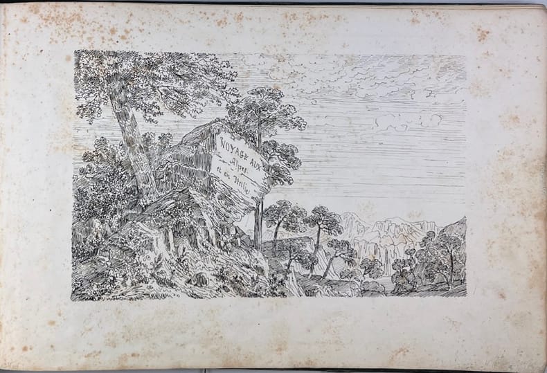 Blondel 362. – Sander 690. – Carteret III, 591. – Erste Ausgabe. – Erschien 1844 gedruckt in «Premiers voyages en Zigzag». Die Reise des Ehepaars Töpffer, die am 21. August 1837 begann und 23 Tage dauerte, führte sie zusammen mit 16 Schülern und ihrem Bediensteten David von Genf nach Mailand. Die Route führte sie zunächst durch das Rhonetal nach Brig, weiter über den Simplonpass und die Valle d'Ossola zum Lago Maggiore. Von dort setzten sie mit dem Schiff nach Locarno über und reisten anschließend über Lugano und Como nach Mailand. Auf dem Rückweg durchquerten sie die Po-Ebene, bevor sie über Aosta und den Col du Bohomme die Savoyer Alpen überquerten und schliesslich nach Genf zurückkehrten. – Einband berieben und bestossen. Durchgehend leicht stockfleckig. Leder auf dem Vorderdeckel mit kleiner Fehlstelle.