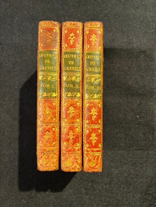 Reprise de l'édition de Prault parue en 1754 ornée en front. du tome 1 d'un portrait de Crébillon d'après de LA TOUR gravé par L.J. CATHELIN. Infimes accrocs de reliure, petit manque à la pièce de tomaison du tome 1, sinon, bel exemplaire dans une agréable reliure de l'époque.