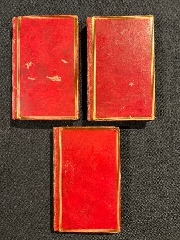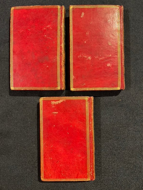 Londres, 1785. 3 volumes in-18 de [4]-298; [4]-316; [4]-276 pages, plein maroquin rouge, dos lisses ornés de filets et fleurons dorés, pièces de titre vertes, tranches dorées..
