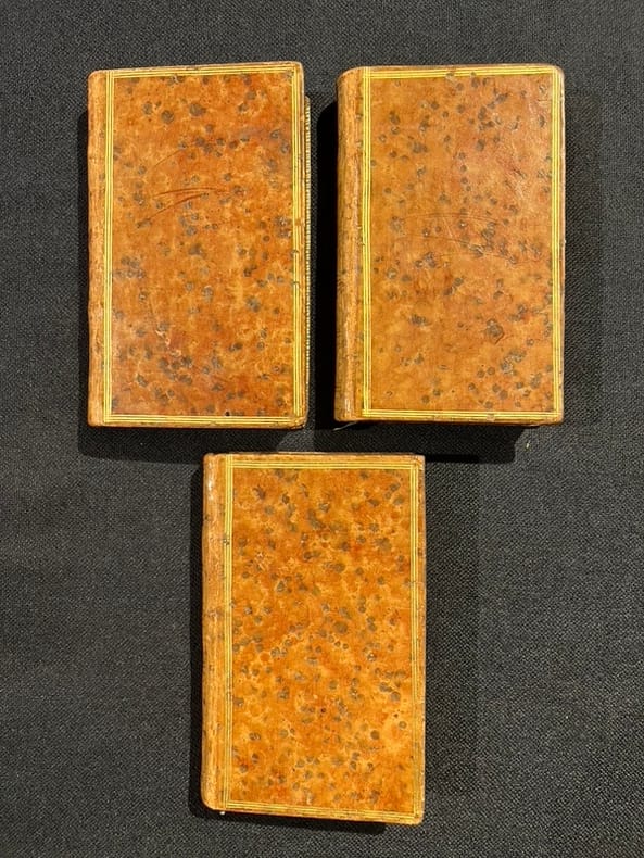 Londres, 1785. 3 volumes in-18 de [4]-298; [4]-316; [4]-276-8 pages, plein veau moucheté, dos lisses ornés de filets et fleurons dorés, pièces de titre beige, tranches dorées.