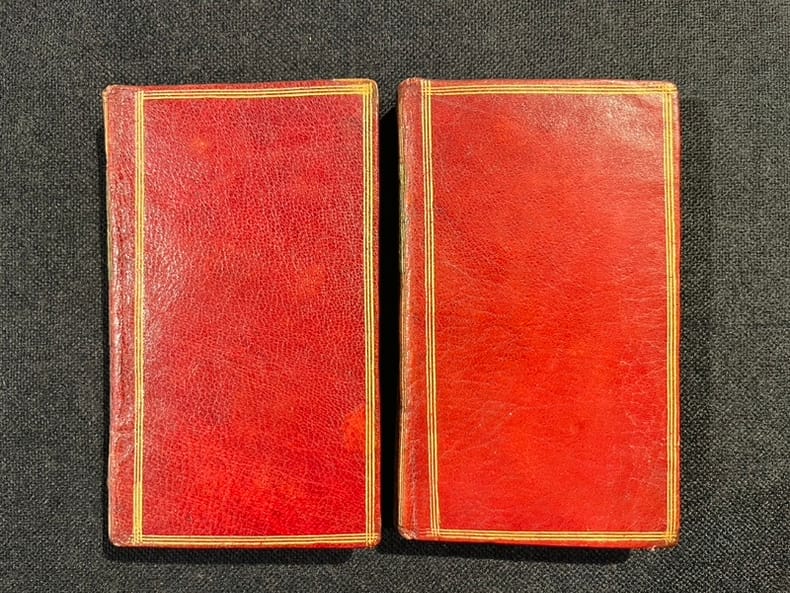 Genève [Lyon], 1782. 2 volumes in-18 de [4]-228 et [4]-203 pages, plein maroquin rouge, dos lisses, filets et fleurons dorés, pièce de titre en maroquin vert, triple filet doré encadrant les plats, tranches dorées.