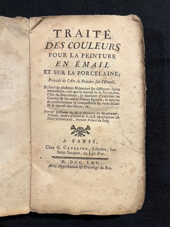 Édition originale. Ouvrage posthume du savant normand Didier François d'Arclais de Montamy.Diderot prépara le manuscrit, obtint de le faire publier, le fit imprimer, et y intéressa Cavelier en lui cédant la propriété littéraire (A.M. Wilson p. 410).Ce volume fut inséré dans les oeuvres complètes de Diderot publiées chez Brière. La première partie expose les procédés et opérations chimiques pour obtenir les différentes couleurs propres à être peintes sur l'émail; la seconde partie est un recueil de mémoires sur divers sujets concernant la décoration et les beaux-arts: porcelaine, stuc, pierres gravées factices et camées, dorure, glaces et miroirs, etc.Bel exemplaire portant l'ex-libris héraldique de Henri de Juvenel.Tchemerzine IV, 451 ; Adams, TA1.