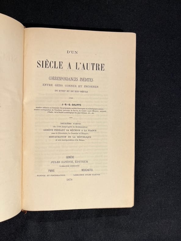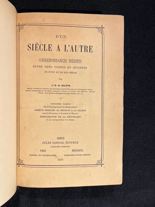 Genève, Jules Sandoz, 1877-1878. 2 volumes in-8, demi-veau glacé châtaigne à coins, dos à nerfs orné de filets et fleurons dorés, armes Genève dorées au centre des plats, têtes rouges. Couvertures conservées.