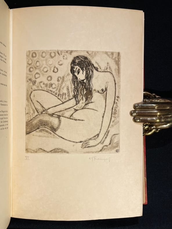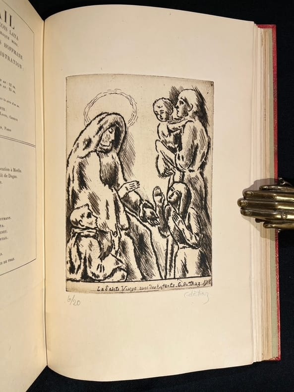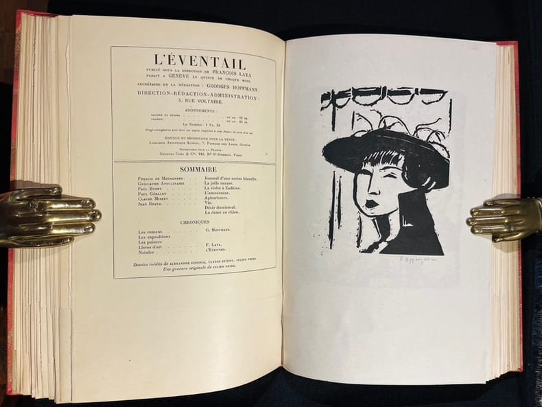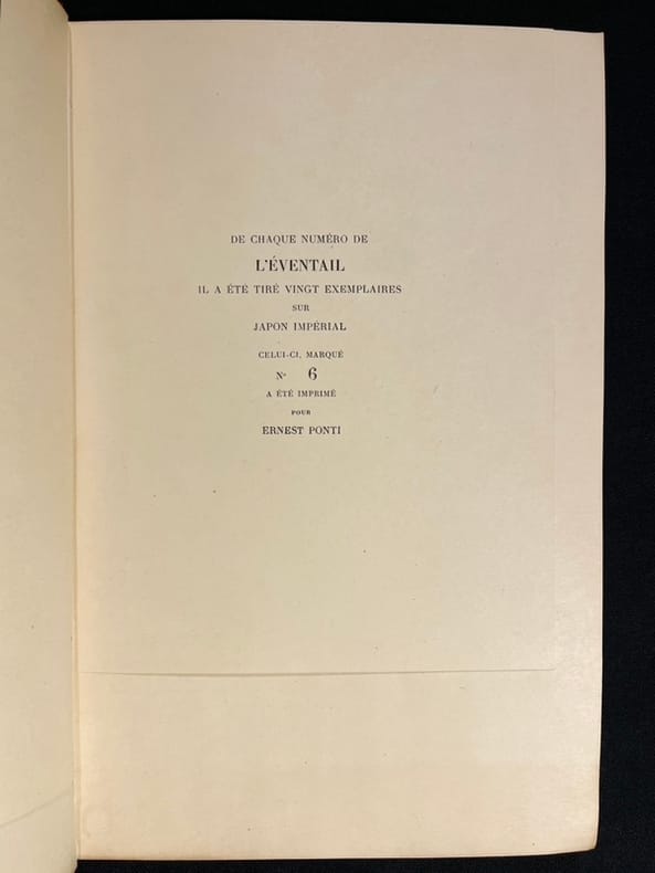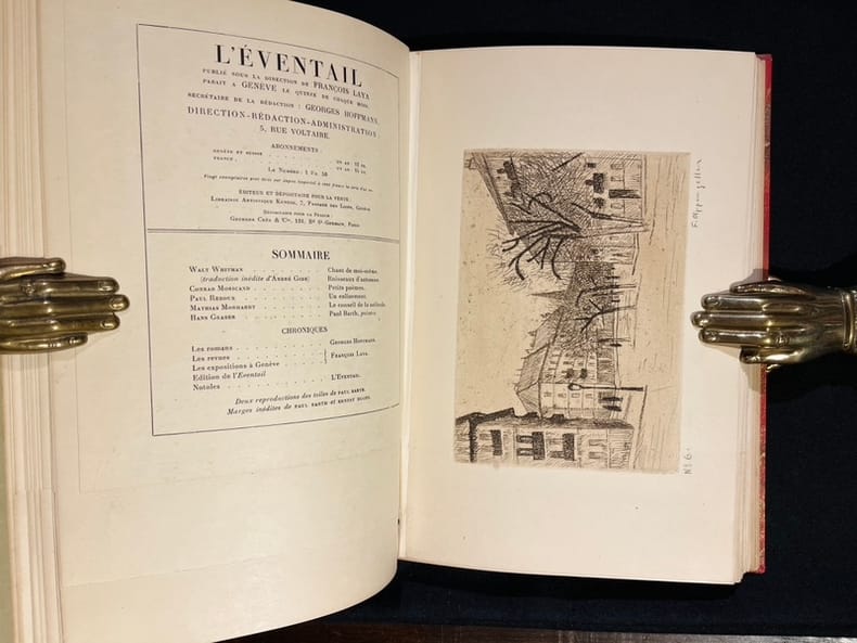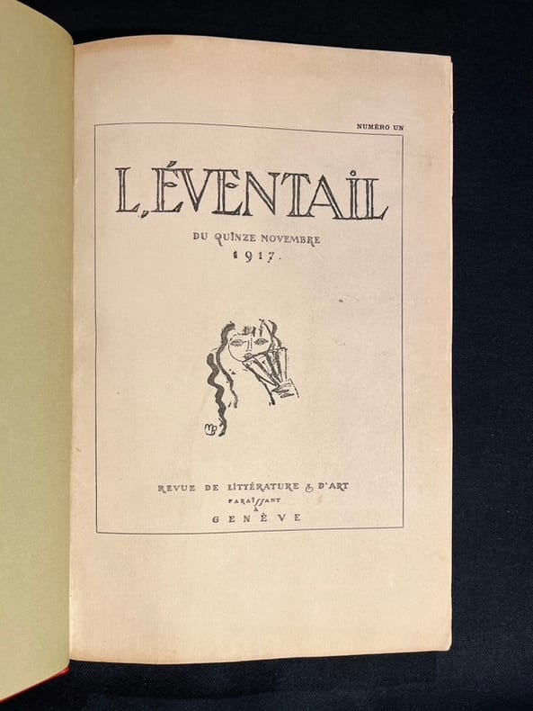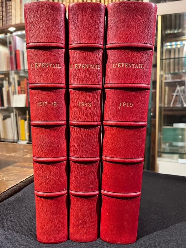 21 fascicules illustrés et enrichis de nombreux originaux numérotés et signés (bois, gravure et litho), parfois en divers états de F. Appenzeller, M. Barraud, Bressler, G. François, G de Traz et J. Prina. Nombreuses reproductions de dessins inédits de M. Barraud, P. Barth, H. Berger, A. Blanchet, E. Bressler, A. Cingria, U. Dutoit, O. Vautier... Egalement des reproductions contrecollées d'œuvres de Cézanne, Daumier, Degas, Delacroix, Modigliani, Monet, Renoir, Rodin, etc.Collection complète en 21 numéros - tout ce qui a paru - de cette belle revue dirigée par François Laya (secrétaire René Louis Piachaud, puis Georges Hoffmann). Magnifique panorama de la vie artistique et littéraire dans la Genève cosmopolite durant la Première Guerre mondiale. François Laya s'entoure de jeunes artistes et écrivains pour commenter sans compromis l'actualité, mais en s'affranchissant délibérément de toute position politique.Nous présentons un des 20 exemplaires de luxe imprimés sur Japon Impérial (13), c'est l'exemplaire d'ErnestPonti, riche collectionneur d'art dont la collection de peinture fut dispersée en 1938 par la Galerie Moos.Les artistes qui collaborent à la revue remettent en cause les conceptions artistiques de la génération précédente. Ils prônent un naturalisme sans concession, et n'hésitent pas à recourir à un érotisme qui choque la pudeur genevoise (d'ailleurs dans le n°3 de 1919, on peut lire l'annonce de la publication du rarissime recueil d'estampe de Barraud Sept pierres d'amour tiré à 20 exemplaires «Voilà de quoi faire tressaillir la pudique cité de Calvin, siège désormais de la Ligue des Nations». Il y aura également les Douze nuits de Claude Misery, illustré par Gustave Buchet de bien sensuelles lithographies, très avant-gardiste, que publie l'Eventail en 1918).On trouve également une critique de publication dadaïste qui semble ne trouver que peu d'approbation de la rédaction... (in n°2,1917 et n°2, 1919). Un bel éloge d'une exposition (Galerie Sauvage à Paris) de Larionow et Gontcharova démontre tout de même que la revue n'était pas en opposition avec les avant-garde abstraites (même si on peut lire de dures critiques envers Picasso). Modigliani aura un bel article également.›Admussen, Les petites revues littéraires 1914-1939, n°92; Hayoz, Bibliographie analytique des revues littéraires de Suisse romande (1900-1981), p. 74-75; Le fonds Paul Destribats, n°90. Édition originale en très belle condition.Toutes les couvertures sont regroupées en fin de chaque volume, les différents fascicules se suivent donc et sont différenciés simplement par le feuillet sommaire venant séparer physiquement les pages de chaque numéro.Les planches hors textes signées venant illustrées cette collection sont, sauf mention contraire, sur papier japon.Volume 1- Première année - en tout 486 pages numérotées (sans les ff. blancs couvertures et planches hors-texteNo. 1, 15.11.1917No. 2, 15.12.1917. Un bois original de G. François (état sur chine relié au n°7)No. 3, 15.01.1918. Un bois original de F. Appenzeler (état sur chine relié au n°5)No. 4, 15.02.1918. Une lithographie de M. Barraud signée à la mine de plomb par l'artisteNo. 5, 15.03.1918. Une 1 estampe originale de Prina + un tirage sur chine numérotée et signée par l'artiste; une seconde estampe originale sur chine numérotée et signée par Prina; 1 bois original de F. Appenzeler numéroté et signé par l'artisteNo. 6, 15.04.1918. Une gravure originale de Bressler numérotée et signée par l'artisteNo. 7, 15.05.1918. Une gravure originale de G. de Traz numérotée et signée par l'artiste; un bois original de G. François sur chine numéroté et signé par l'artisteVolume 2No. 8, 15.06.1918No. 9, 15.07.1918. Une gravure originale de F. Appenzeler numérotée et signée par l'artisteNo. 10, 15.10.1918No. 11, 15.11.1918. Une gravure originale sur papier vergé de M. Barraud numérotée et signée par l'artisteNo. 12, 15.12.1918Vol. 3 Deuxième année - en tout 348 pages numérotées (sans les ff. blancs couvertures et planches hors-texte)No. 1, 15.01.1919No. 2, 15.02.1919No. 3, 15.03.1919. Une gravure originale de G. François numérotée et signée par l'artisteNo. 4, avril-mai 1919No. 5, 15.06.1919No. 6, 15.07.1919No. 7, 15.08.1919No. 8, 15.09.1919. Cinq bois originaux de H. Bischoff plus deux bois originaux sur papier vergéNo. 9, 15.10.1919.Quatre bois originaux de Rouveyre.