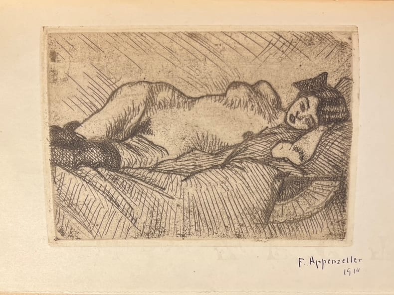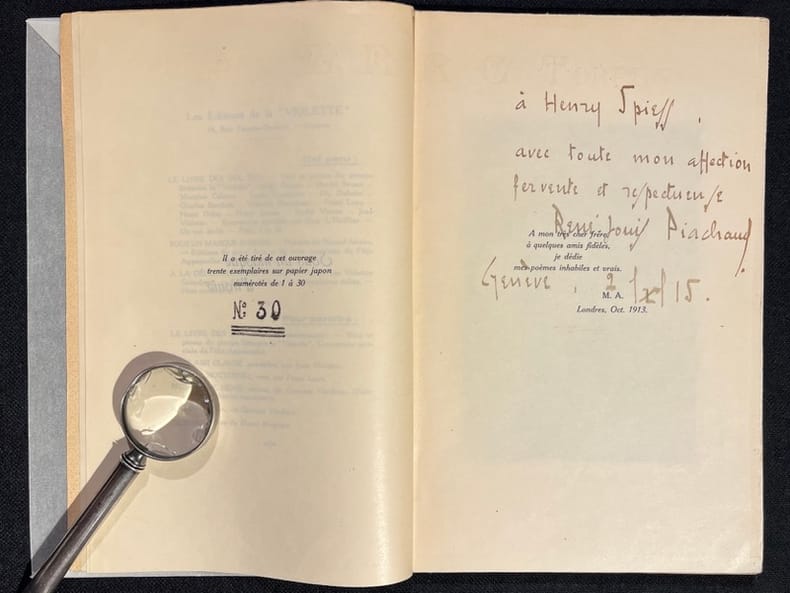Illustré d'un beau frontispice gravé à l'eau-forte de Felix Appenzeller et signé et daté à l'encre. Édition originale du premier livre de René-Louis Piachaud, publié sous un pseudonyme. Un des 30 exemplaires imprimés sur papier Japon (30), seul tirage numéroté. Envoi de l'auteur daté de 1915 " à Henry Spiess, avec toute mon affection fervente et respectueuse". En outre on trouve trois corrections autographes (p. 69, 79, 89). Rare. De la prestigieuse bibliothèque de Théophile Bringolf, avec son ex-libris, cet exemplaire a figuré dans le catalogue rédigé en 1981 par Maurice Bridel - "Quelques écrivains suisses romands du XVIIIe au XXe", sous le n° 321, alors au prix de 300 chf.