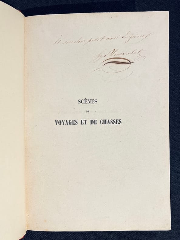 Édition originale de ce recueil de récits anonymes anglais et allemands traduits très librement ou même adaptés en français par Henri Blanvalet. Ce sont des récits qui se déroulent en Amérique. Amusant frontispice gravé sur bois de X.A. v. Eduard Kretzchmar, montrant « le traducteur» en cavalier dans un décor très « Bernardin de Saint-Pierre» ! Superbe exemplaire non rogné portant cet envoi autographe: "A son cher petit ami Eugène. H. Blanvalet"; fraîche reliure romantique; étui moderne. De la prestigieuse bibliothèque de Théophile Bringolf, avec son ex-libris, cet exemplaire a figuré dans le catalogue rédigé en 1981 par Maurice Bridel - "Quelques écrivains suisses romands du XVIIIe au XXe", sous le n° 96, alors au prix de 575 chf.