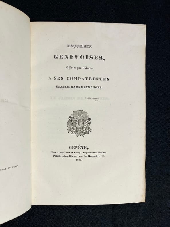 Orné de jolis culs-de-lampe. Édition originale. Ces esquisses sont en vers, aux thèmes essentiellement genevois: La Clémence, le Salève, les Vendanges de Bonne,... [Burgy, Les sources imprimées de la Restauration genevoise - 1769]. De la prestigieuse bibliothèque de Théophile Bringolf, avec son ex-libris, cet exemplaire a figuré dans le catalogue rédigé en 1981 par Maurice Bridel - "Quelques écrivains suisses romands du XVIIIe au XXe", sous le n° 106, alors au prix de 220 chf. Bel exemplaire.