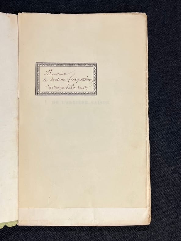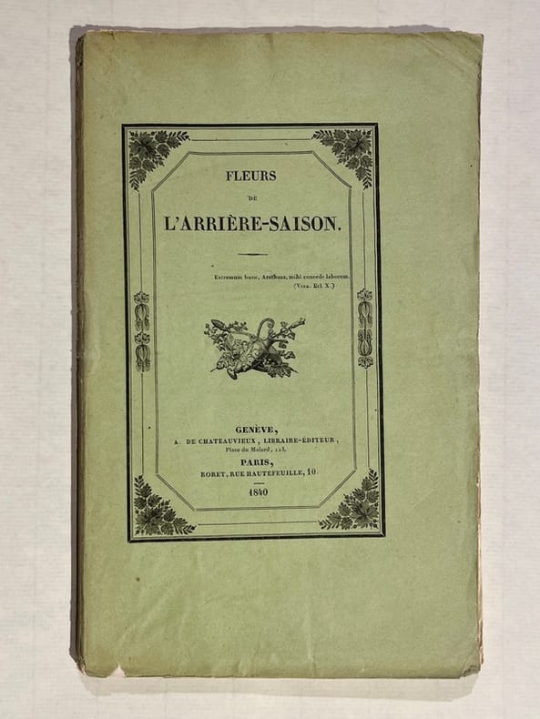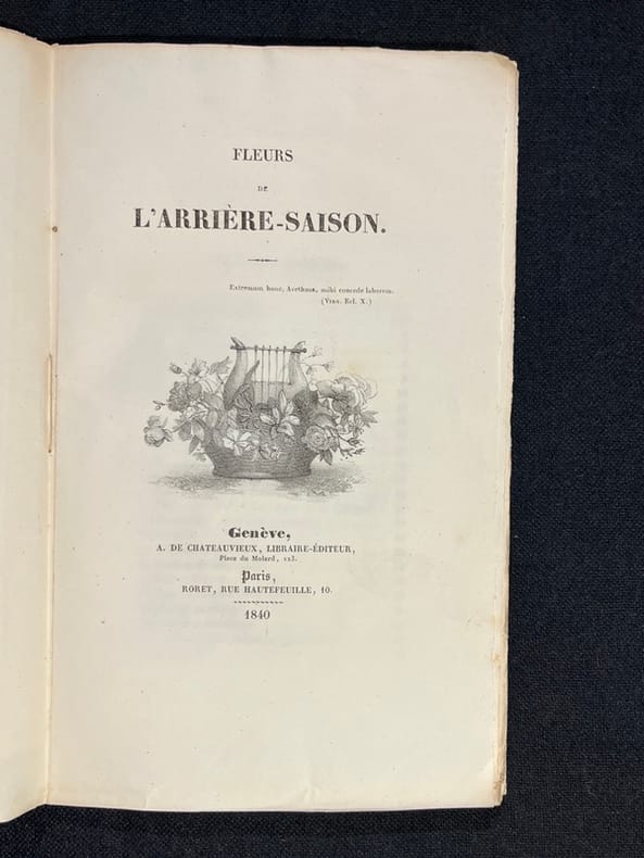 Édition originale joliment décorée d'un vignette lithographiée sur la page de titre et de jolis bandeaux. Sur un feuillet monté avant le faux-titre, dans un cartouche imprimé, envoi autographe à "Monsieur le docteur Chaponnière, hommage de l'auteur". De la prestigieuse bibliothèque de Théophile Bringolf, avec son ex-libris, cet exemplaire a figuré dans le catalogue rédigé en 1981 par Maurice Bridel - "Quelques écrivains suisses romands du XVIIIe au XXe", sous le n° 108, alors au prix de 175 chf. Bel exemplaire.