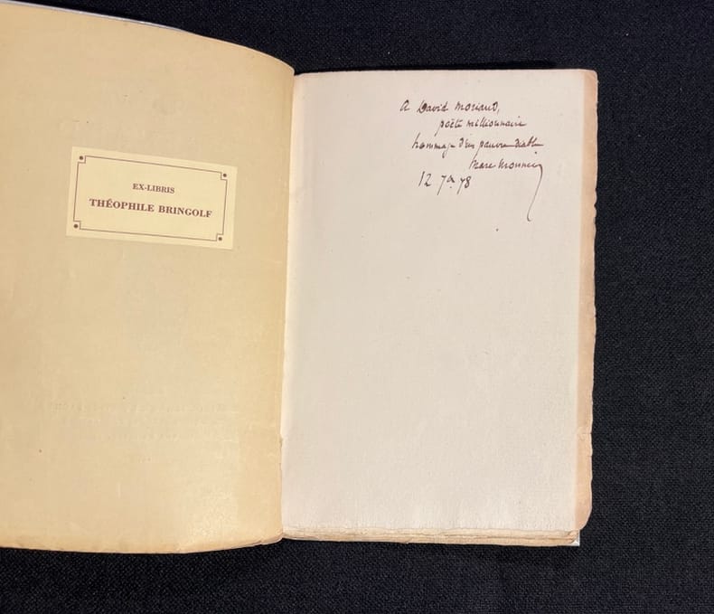 Édition originale dédicacée en vers au docteur Dufour qui vient de l'opérer de la cataracte. Joli envoi autographe : " A David Moriaud, poëte millionnaire hommage d'un pauvre diable. Marc-Monnier 12 7bre 78". David Moriaud, poète, promoteur et avocat est à l'origine de l'établissement thermal et de l'hôtel Beau-Séjour à Champel; mais également de la tour de Champel. De la bibliothèque de Théophile Bringolf, avec son ex-libris, cet exemplaire a figuré dans le catalogue rédigé en 1981 par Maurice Bridel - "Quelques écrivains suisses romands du XVIIIe au XXe", sous le n° 118, alors au prix de 150 chf. Imprimé sur un joli papier vergé. Bel exemplaire.