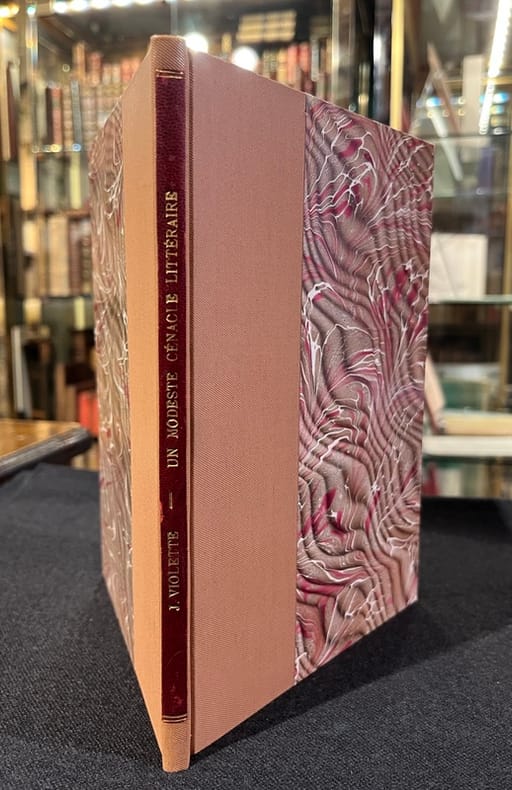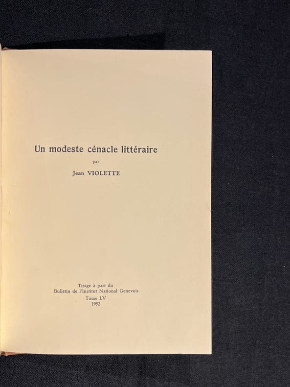 Édition originale, tiré à part du Bulletin de l'Institut National Genevois, tome LV. Joli article sur l'histoire du Groupe La Violette, devenu plus tard le Groupe Jean Violette. "Tous ces écrivains du dimanche besognent le jour à une tâche nourricière, car notre pays minuscule ne peut entretenir ses ombreux poètes; mais ils puisent dans la pratique des lettres et dans le culte de l'amitié des tourments et des plaisirs qui embellissent leur existence. Que restera-t-il de tout cela ? Le «Patron » ne se permet pas d'illusions. Il a longtemps catalogué dans une vaste bibliothèque, où il a vu des milliers de livres qui, sur les rayons, demeurent à jamais silencieux. On ne perçoit plus le moindre écho du bruit presque imperceptible qu'ils firent une seconde lors de leur fraîche nouveauté.Cependant il reste de cet effort collectif la joie pour chacun d'avoir vécu de la vie de l'esprit et découvert la vraie richesse, dans leur âme. Le « Patron » ferme l'Album de la Violette et sourit. Jean VIOLETTE" Dernier paragraphe de l'article. De la bibliothèque de Théophile Bringolf, avec son ex-libris.