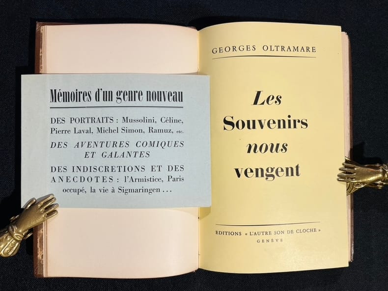 Édition originale, avec sa bande de lancement: "Mémoires d'un genre nouveau. Des portrait: Mussolini, Céline, Pierre Laval, Michel Simon, Ramuz, etc. Des aventures comiques et galantes. Des indiscrétions et des anecdotes: l'Armisitce, Paris occupé, la vie à Sigmaringen..." Envoi autographe de l'auteur. Tampon sur la couverture.